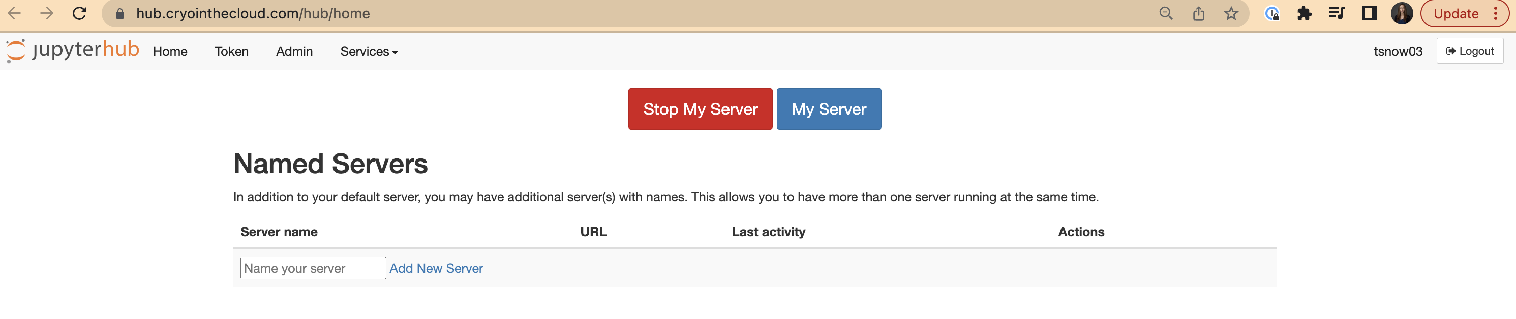 Whenever you are done, it is best to shut down your server when you sign out to save on money for CryoCloud. Time on the JupyterHub costs money and there are systems in place to make sure your server doesn’t run indefinitely if you forget about it. After 90 minutes of no use, it will shut down. We prefer you shut down the server when so we save that 90 minutes of computing cost.
